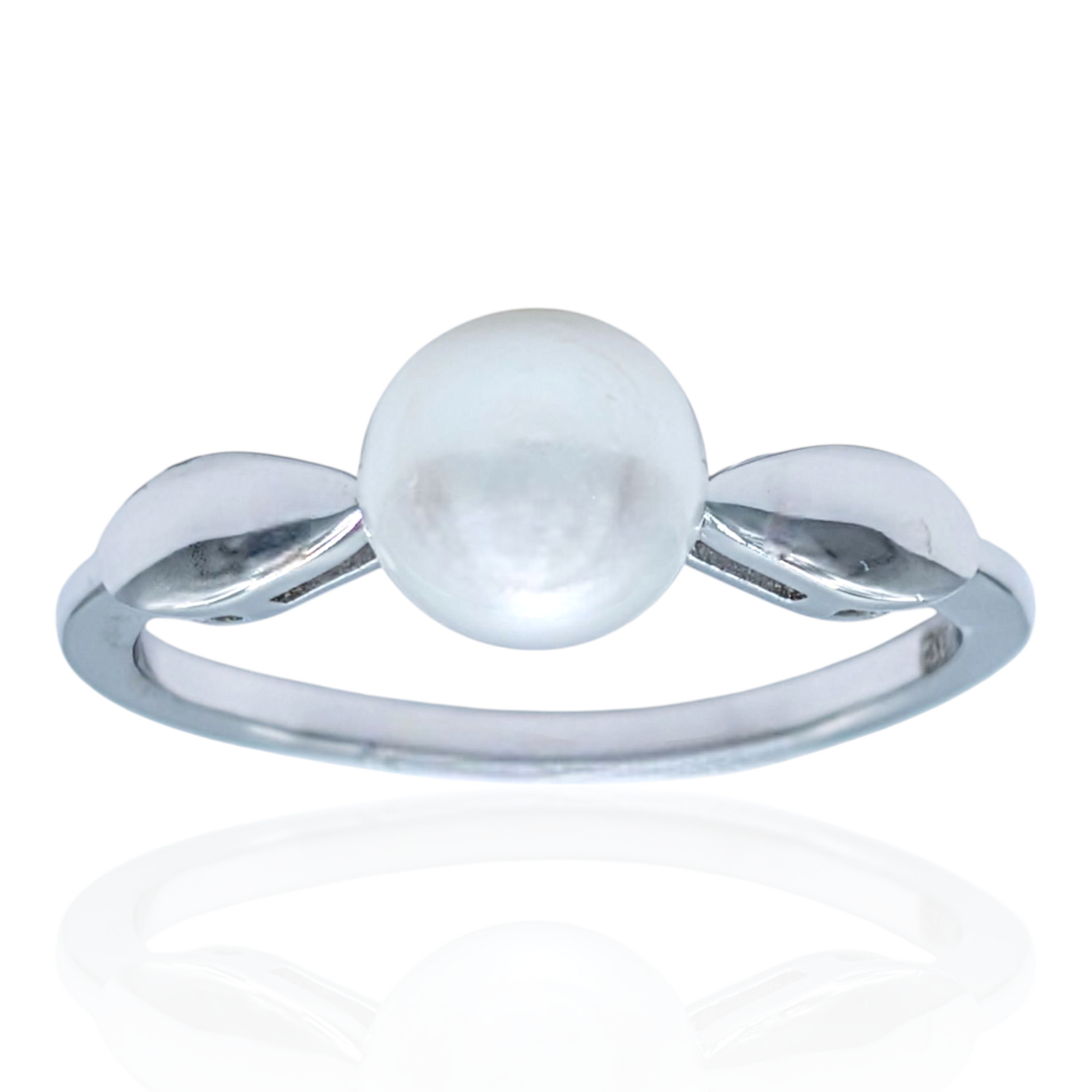 Sublimez votre main avec cette bague en argent 925 rhodié, un bijou qui allie finesse et caractère. Le corps de la bague, protégé par un traitement au rhodium pour une brillance durable et une résistance aux rayures, est orné d'une perle blanche centrale à l'éclat satiné. Son design unique est agrémenté de motifs latéraux en relief, évoquant une esthétique à la fois organique et moderne.