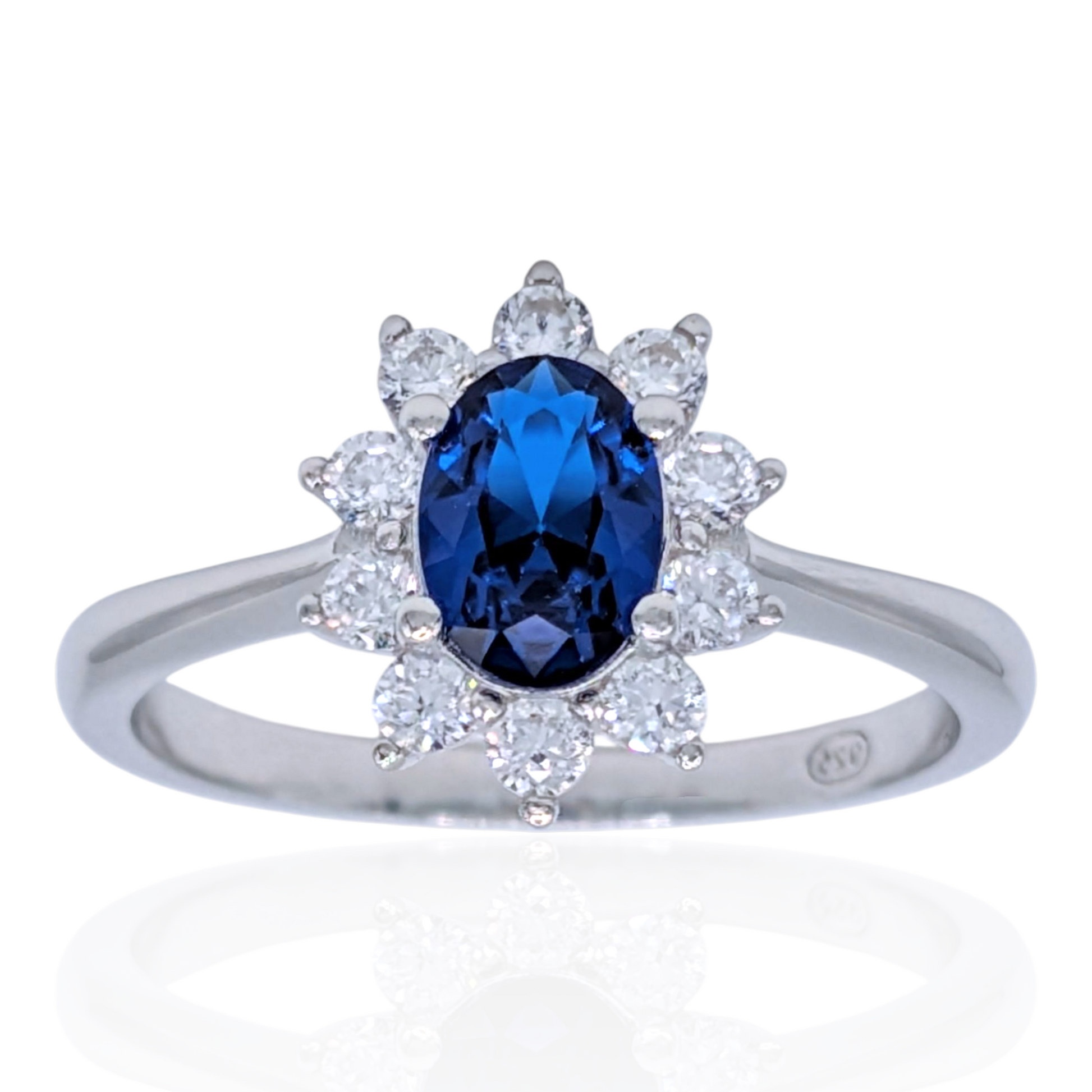 Bague Fleur Argent 925 Rhodié, Corindon Synthétique Bleu et Oxyde de Zirconium