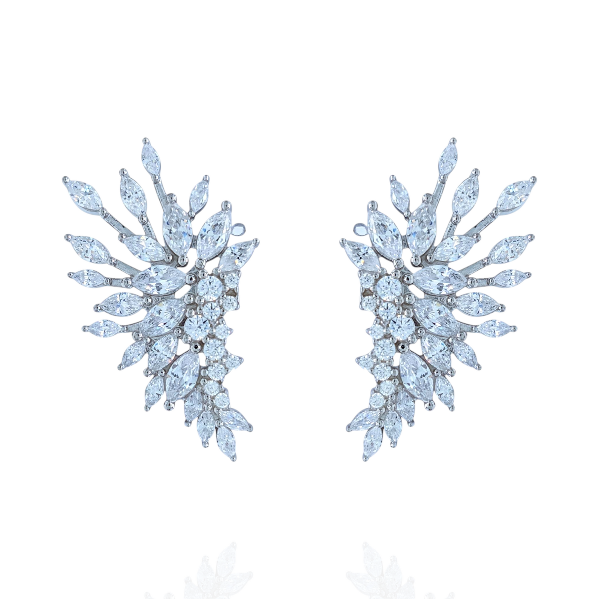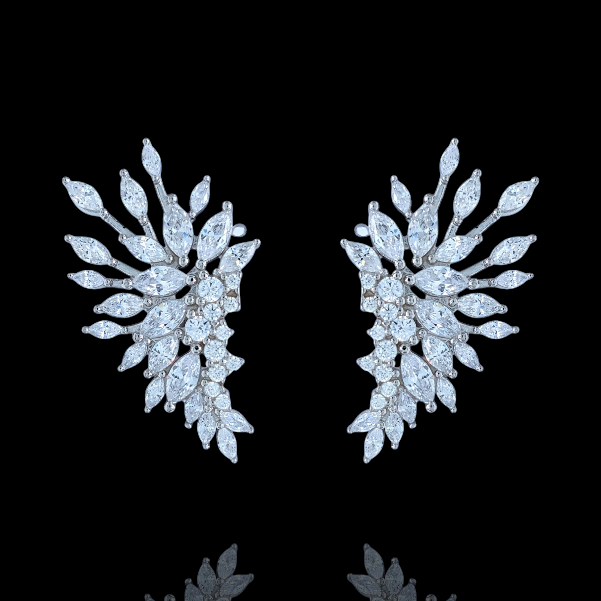 Affirmez un style audacieux et sophistiqué avec ces magnifiques boucles d'oreilles en argent 925 rhodié, dotées d'un fermoir poussette pour un maintien parfait le long du lobe. Leur design spectaculaire, évoquant une aile scintillante ou une gerbe de lumière, est entièrement pavé d'oxydes de zirconium blancs de tailles variées, notamment des coupes marquises, créant un éclat éblouissant. L'argent 925 rhodié garantit une brillance exceptionnelle et une résistance durable, protégeant ces bijoux du ternissement. Idéales pour les soirées glamour, les mariages ou pour toute occasion où vous souhaitez faire une déclaration de mode, ces boucles d'oreilles sont un choix très tendance. Elles apporteront une touche de luxe moderne et une lumière incomparable à votre visage.
