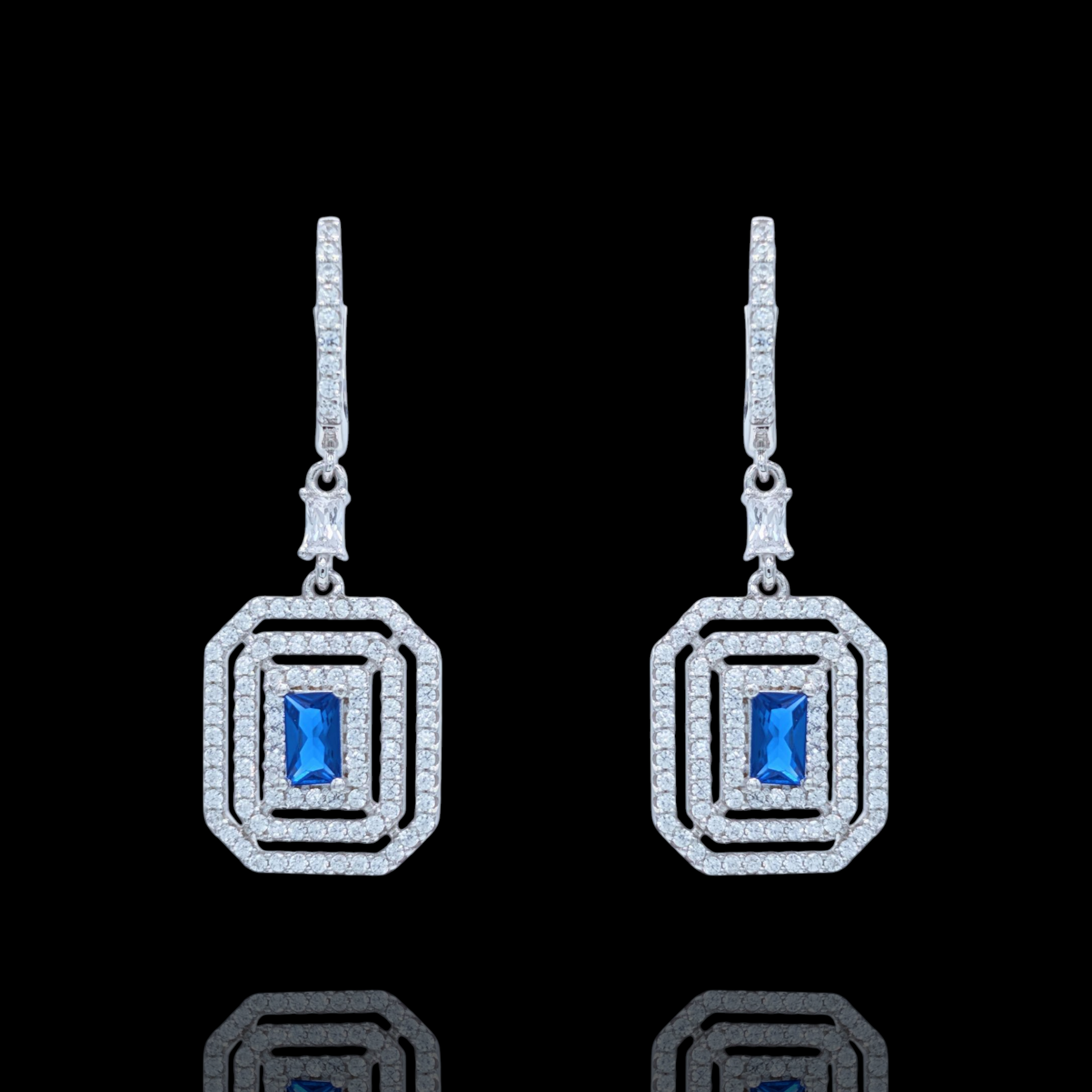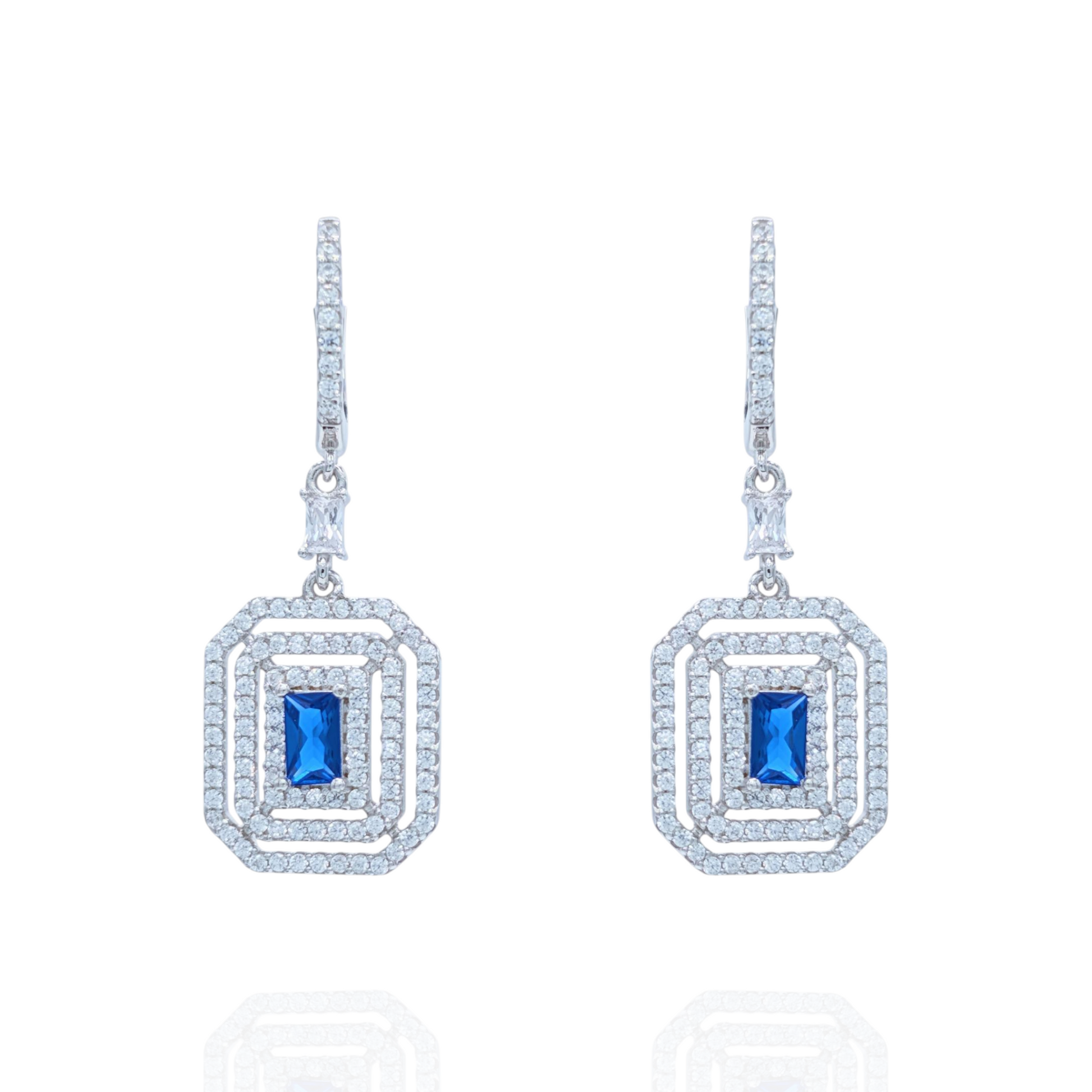 Illuminez votre visage avec ces somptueuses boucles d'oreilles pendantes en argent 925 rhodié. Leur design géométrique Art Déco est à la fois moderne et incroyablement chic. Chaque boucle arbore un corindon synthétique bleu éclatant, taillé en rectangle, magnifiquement encadré par des halos concentriques d'oxydes de zirconium scintillants. L'argent rhodié de haute qualité assure une brillance durable et une protection optimale contre le ternissement. Ces bijoux sont l'accessoire luxe parfait pour une soirée spéciale, un mariage ou pour faire un cadeau mémorable. Elles ajoutent une touche d'élégance spectaculaire, capturant la lumière à chaque mouvement. Adoptez ces pendants pour un style résolument sophistiqué et intemporel.