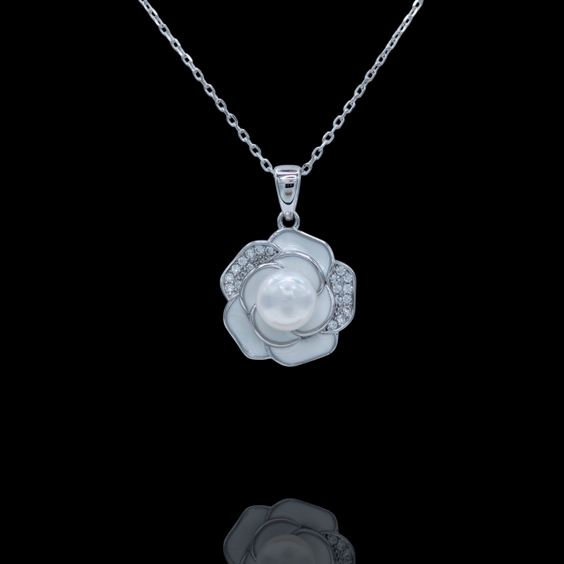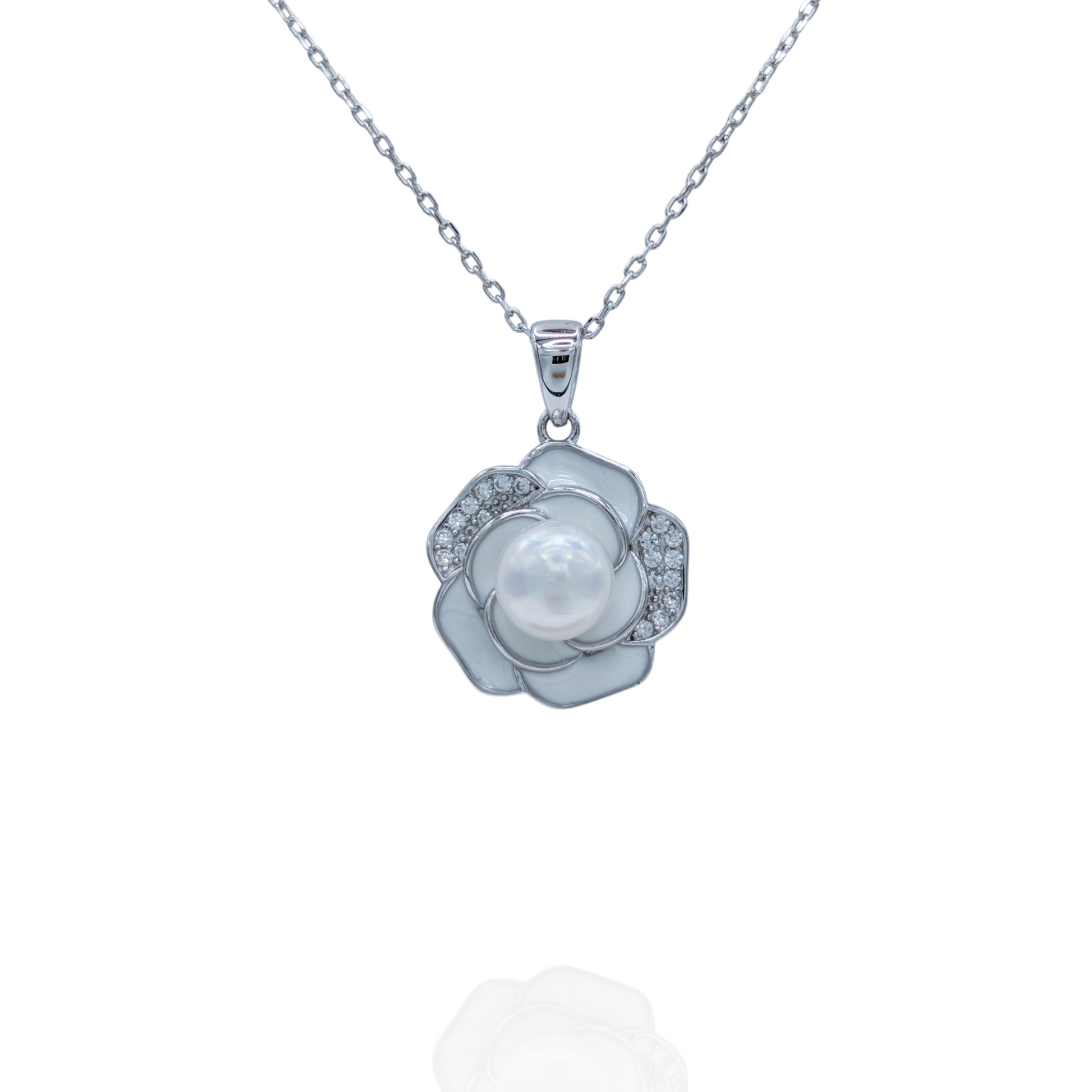Collier Pendentif Fleur Blanche Argent 925 Rhodié, Perle et Oxyde de Zirconium