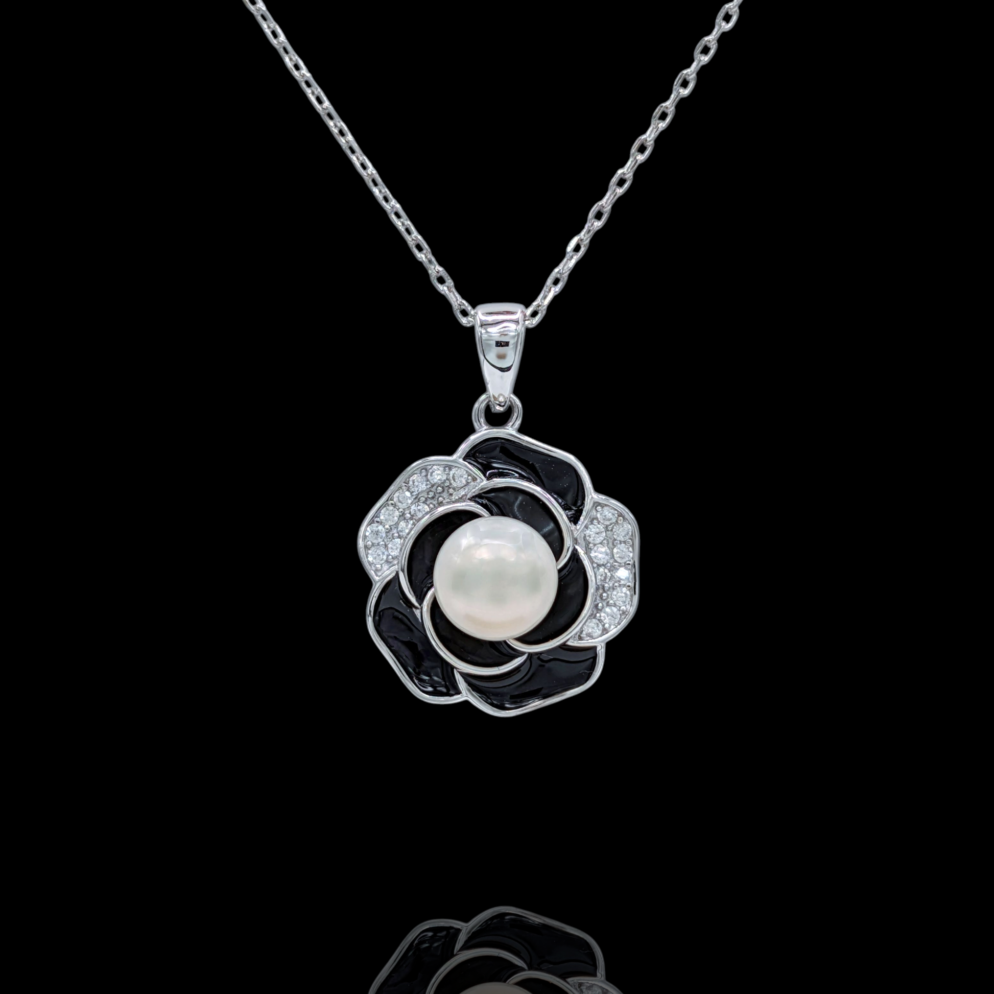 Collier Pendentif Fleur Noire Argent 925 Rhodié, Perle et Oxyde de Zirconium
